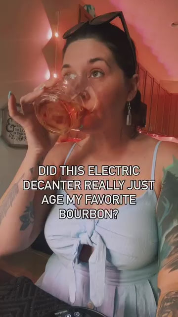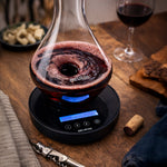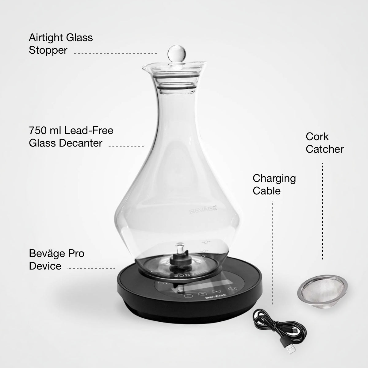 750 ml lead-free glass decanter with easy-pour spout, volume indicators (4 oz, 6 oz, 8 oz, 12 oz), airtight glass stopper, sediment screen (Cork Catcher®), USB-A to USB-C cable, instruction manual, time guide, smart decanter system